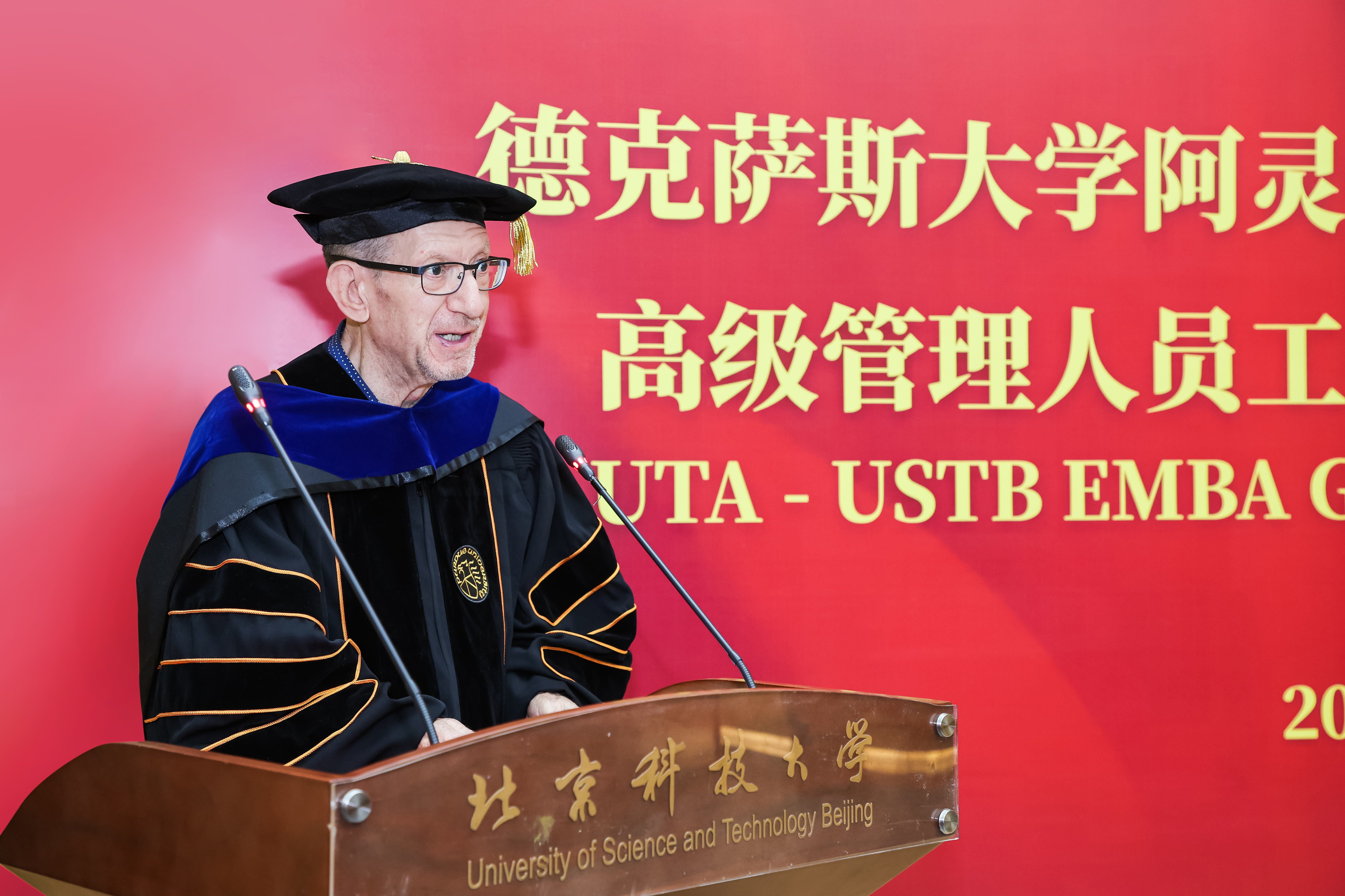 张大林宣布典礼开始,谷炜与Daniel Himarios共同宣布2025届高级管理人员工商管理硕士学位(UTA-USTB EMBA)授予决定。