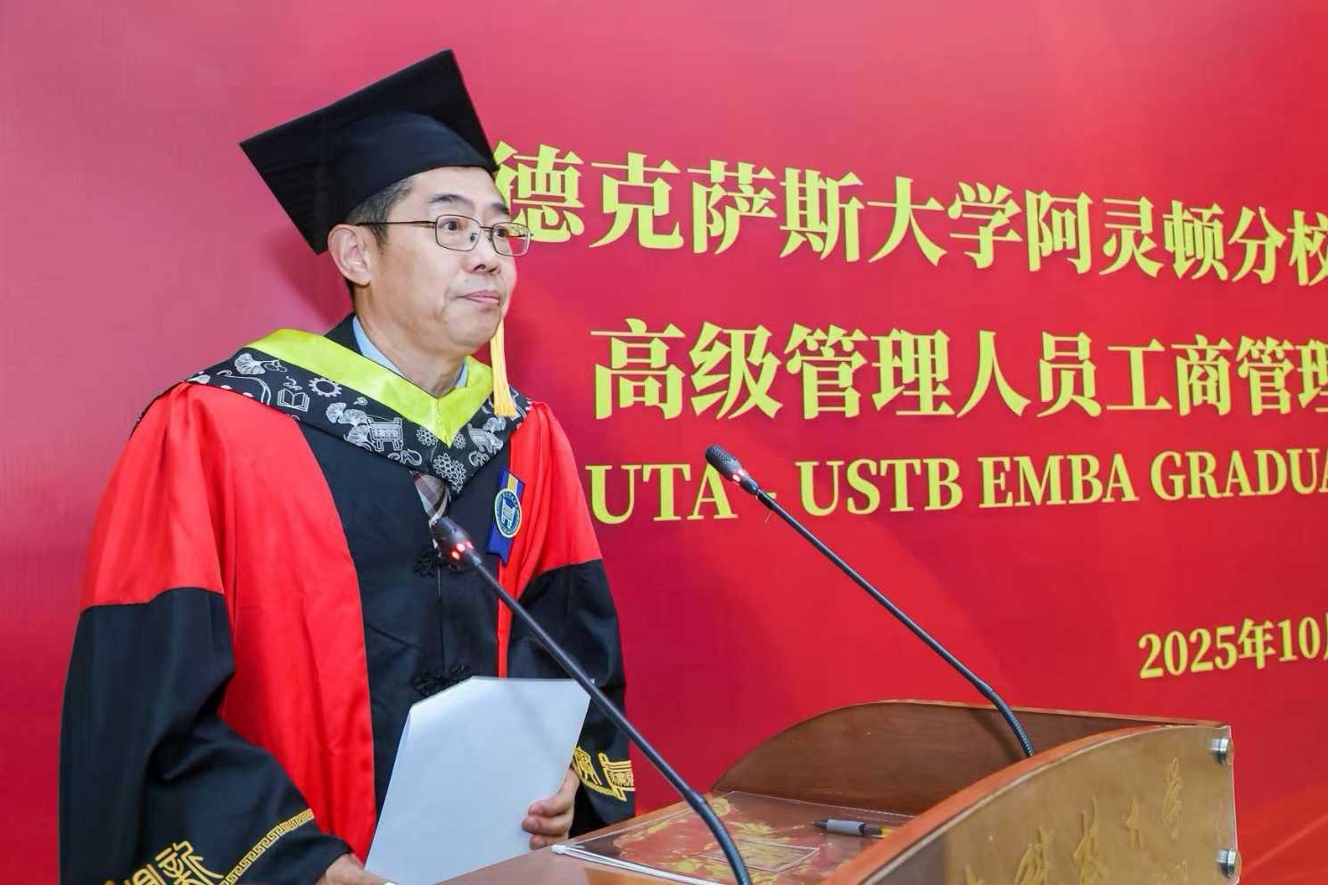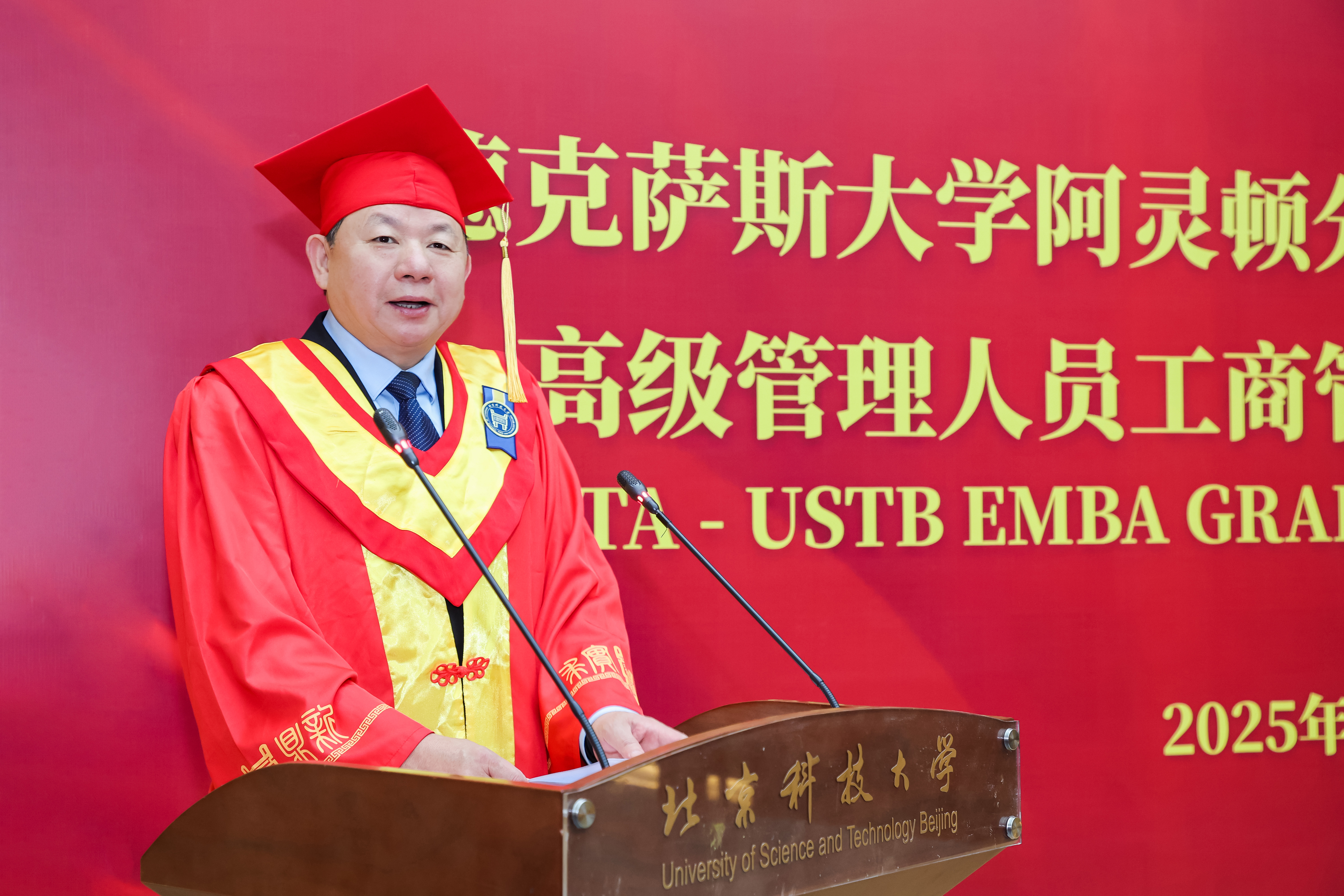 杨仁树向2025届UTA-USTB EMBA毕业生表示热烈祝贺,并向德克萨斯大学阿灵顿分校自2002年至今对学校该学位项目的支持表示衷心感谢。他表示,希望同学们不但要传承学校“求实鼎新”的校训精神、承载H片 “德性实践,学道创新”的院训精神,更要在未来的生活中胸怀梦想、脚踏实地、行稳致远;希望同学们继续关心支持学校的建设发展,母校永远敞开怀抱,欢迎毕业生回家。