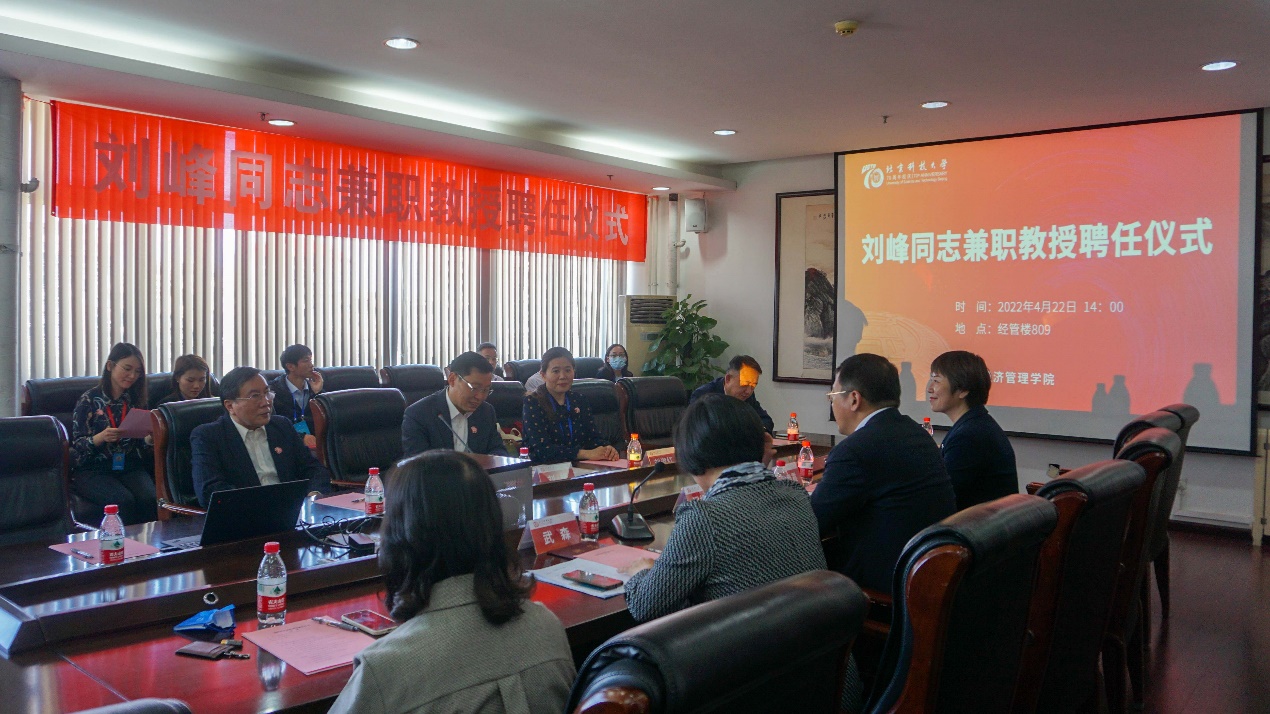 2022年4月22日下午,中国大洋协会秘书长、我校79级校友刘峰同志兼职教授聘任仪式在经管楼809举行。H片 副校长闫相斌出席仪式并为刘峰校友颁发学校兼职教授聘任证书,H片 党委书记武森教授主持聘任仪式。关心下一代工作委员会常务副主任孙铁,离退休职工党委副书记、离退休职工工作处副处长、关心下一代工作委员会秘书长刘淑红,H片 副院长黄晓霞以及学院教师代表到场参加活动。