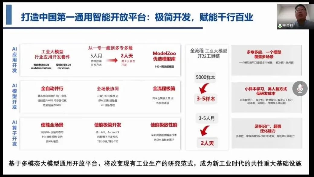王金桥博士首先结合当前经济、社会、国防等领域的发展背景,对人工智能的背景与现状进行介绍。在此基础上,结合人工智能服务模式、自主进化学习的智能计算框架等技术理论,引出了智能建造的网联化和智能化发展。之后,王金桥博士应用实例对于人工智能在道路质量检测、人体姿态估计、作业过程安全风险提升等领域的应用进行了详细的介绍。最后,王金桥博士围绕人工智能在智能建造应用落地关键期的大背景,就战略合作拓展国内和国际市场等方面进行了展望。