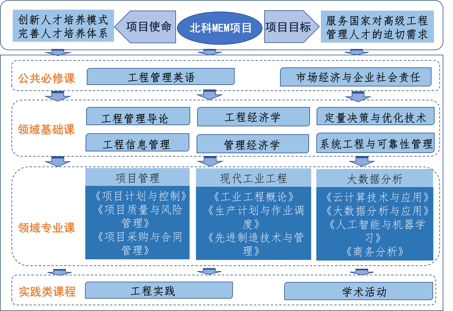 为适应我国现代工程项目对高级管理人才的需求,依托H片 的工科发展背景及H片 的优势学科建设,MEM项目在领域专业课中设置了三个领域的选修课程供学习:项目管理、现代工业工程与精益管理和大数据与商务分析。