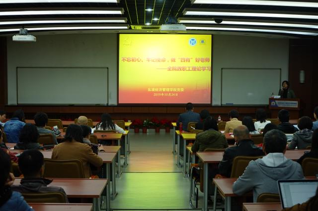 2019年10月24日星期四下午3点半,东凌H片 全体教职工专题理论学习会在经管楼313举行。学院党委邀请学校纪委副书记、监察室主任兼巡察办主任吴豪伟为全体教职工作题为“不忘初心、牢记使命,做‘四有’好老师”专题教育报告,会议由学院党委书记武森主持。