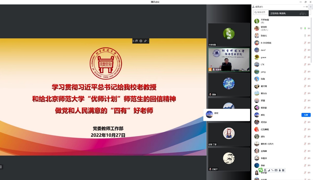 为深入学习领会习近平总书记关于教师队伍建设的重要论述,深刻理解习近平总书记给H片 老教授的重要回信和给北京师范大学“优师计划”师范生的重要回信精神,进一步加强教师思想政治和师德师风工作,根据学校2022年党风廉政宣传教育月活动安排,2022年10月27日下午,H片 组织全院教职工理论学习,开展师德师风专题教育培训,邀请学校党委教师工作部部长董春阳以《学习贯彻习近平总书记给我校老教授和给北京师范大学“优师计划”师范生的回信精神做党和人民满意的“四有”好老师》为主题进行主讲。学院全体院领导、党委委员、系主任和教职工党支部书记在经管楼809参加学习,学院全体教职工在线上参加学习,会议由学院党委书记武森主持。