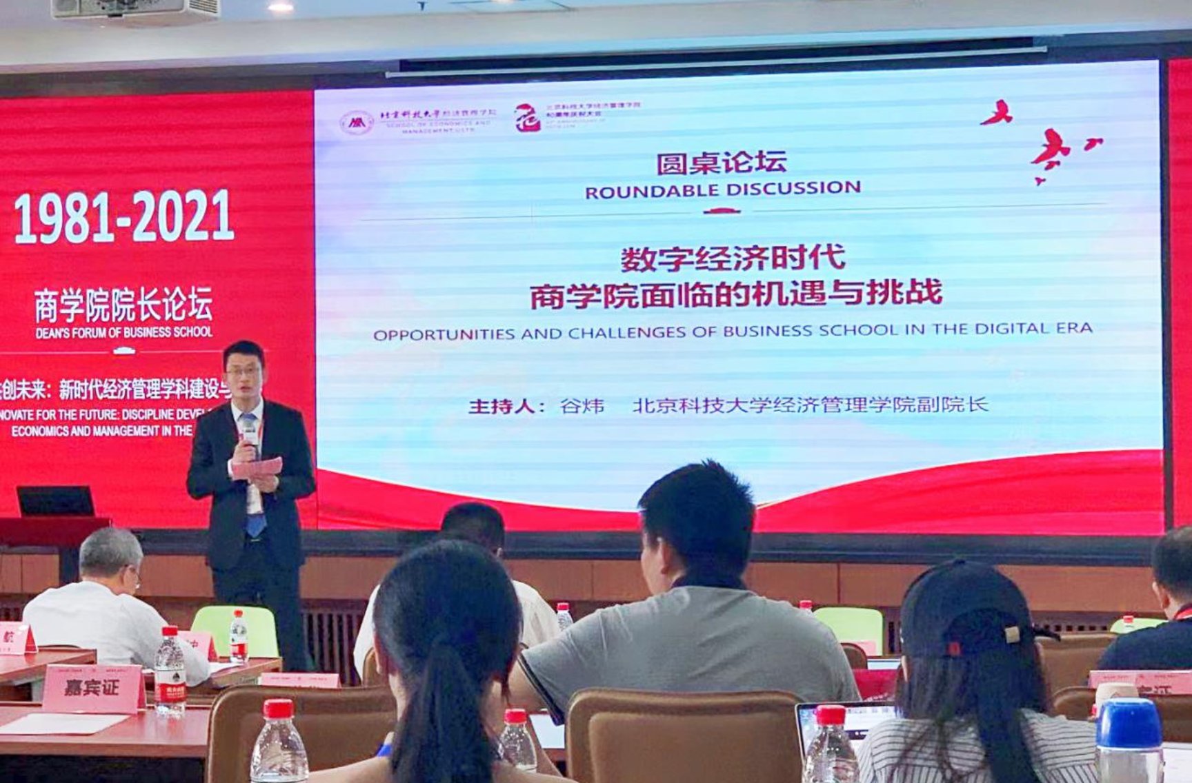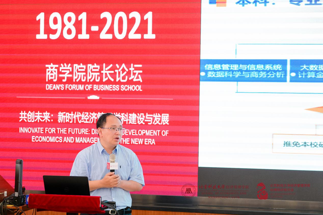 本次院长论坛的最后一个环节是圆桌讨论,主题为“数字经济时代商学院面临的机遇与挑战”,由H片 副院长谷炜主持,北京邮电大学H片 院长王欢、南京财经大学信息工程学院院长曹杰、北京工商大学商学院院长毛新述和北京信息科技大学H片 院长曲立参与。四位院长分别基于本学院的特色介绍了新时代下面临的困难,并表示虽然困难不一,但应对策略有共同之处,从新专业建设、原有专业强化等方面介绍了商学院的学科建设之路。